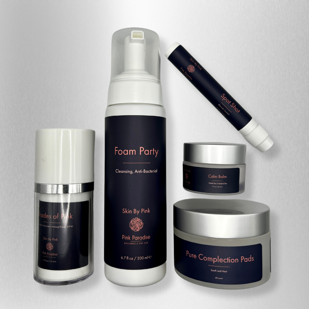 Tackle adult acne head-on with The Adult Acne Kit (AM), a comprehensive skincare suite designed specifically for the unique challenges of adult acne. This powerful kit includes Foam Party, Spot Shot, Shades of Pink, Calm Balm, and Pure Complexion Pads—each selected for their effectiveness in combating acne while catering to adult skin’s need for gentle care and rejuvenation.