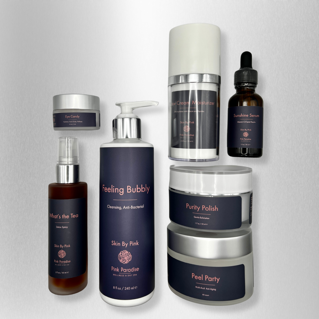 Embrace the essence of expert esthetic care with The Nesti in an Esti Kit (AM | PM), a deluxe collection of skincare essentials crafted to provide a professional, comprehensive routine for both morning and night. This kit features Feeling Bubbly, Eye Candy, What's the Tea, Purity Polish, Sunshine Serum, Peel Party, and Renew Cream Moisturizer, each selected for their exceptional ability to cleanse, treat, and nourish your skin, ensuring optimal health and radiance.