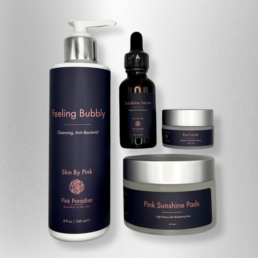 - Exfoliate and Protect with Pink Sunshine Pads: Use Pink Sunshine Pads for a gentle exfoliation that reveals fresh, radiant skin. Infused with skin-brightening ingredients, these pads prepare your skin to fully absorb the benefits of Sunshine Serum and offer an additional layer of protection.