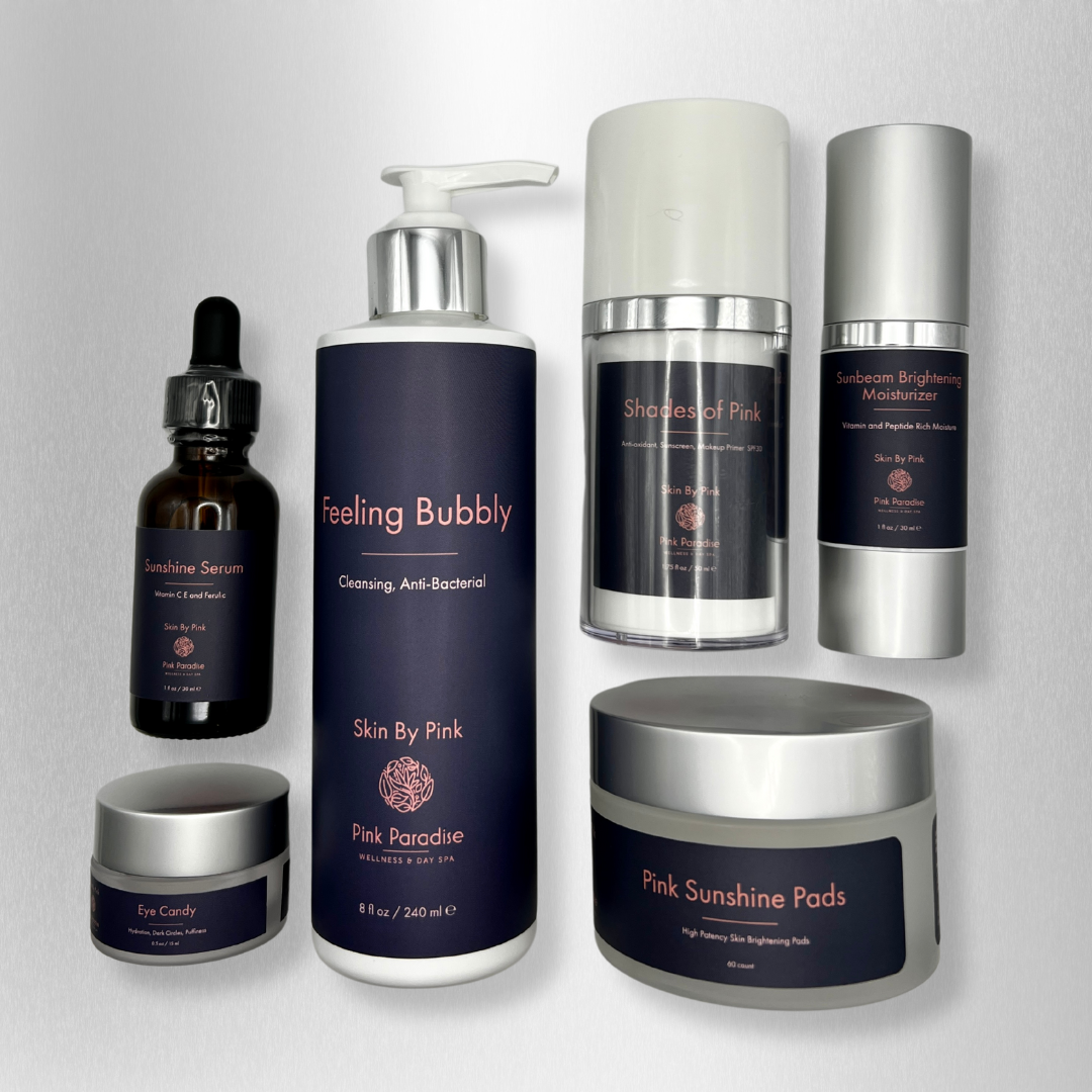 Introducing The Pigmentation Kit (AM), a comprehensive skincare regimen designed specifically to target and diminish the appearance of pigmentation, while enhancing your skin's natural radiance. Featuring Feeling Bubbly, Shades of Pink, Eye Candy, Sunbeam Brightening Moisturizer, Sunshine Serum, and Pink Sunshine Pads, this curated collection combines the most effective ingredients and formulas to brighten, protect, and revitalize your complexion.